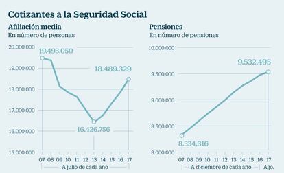 El sistema de Seguridad Social paga a fecha de hoy un total de 9.532.945 pensiones contributivas --de jubilación, incapacidad, viudedad, orfandad y en favor de familiares--. Estas prestaciones se costean con las cotizaciones de 18,48 millones de afiliados que existen en la actualidad. Esta correlación indica que en la actualidad se abonan 1,2 millones de pensiones más que en 2007, antes de la crisis y, sin embargo, el sistema cuenta con un millón menos de cotizantes para hacer estos pagos.