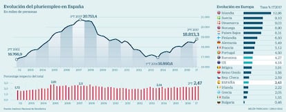 Si se compara con Europa, España está en el furgón de cola. Solo Irlanda, Grecia, Italia y Bulgaria tienen menos porcentaje de pluriempleados. Tanto en la Unión Europea como en la zona euro el pluriempleo se sitúa en el entorno del 4% del total de ocupados;el doble que en España pero muy lejos de los niveles que alcanzan los países nórdicos, todos ellos con un porcentaje de pluriempleo superior al 8%.
