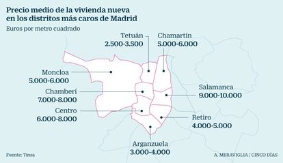 Ese alto valor de los terrenos llevará a que las casas se comercialicen a un precio aproximado de 6.000 euros por metro cuadrado, según calculan varias fuentes. Esa cifra supone alcanzar a otras zonas más caras de la capital y prácticamente doblar el precio de venta de vivienda nueva en el distrito de Arganzuela, donde se localiza el estadio. En ese barrio los pisos nuevos se venden en una horquilla de entre 3.000 y 4.000 euros por metro cuadrado, según la tasadora Tinsa, con datos de 2017.