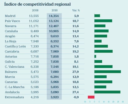 Extremadura no solo es la comunidad menos competitiva, sino que también es la única que ha empeorado en el periodo 2008-2016. Sin registrar tasas negativas, Asturias (1,8%), Madrid (5,9%) y La Rioja (7,6%) son las comunidades que han cosechado un resultado más discreto.
