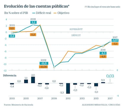 España cumplió el objetivo de déficit público de 2017. Esta vez sin matices y sin trucos. Los números rojos ascendieron a 35.758 millones de euros, cifra que equivale al 3,1% del PIB, el límite comprometido con Bruselas. El ministro de Hacienda, Cristóbal Montoro, destacó que España rebajó su déficit público en 12.254 millones a lo largo del año pasado. Un ajuste notable. La reducción de los números rojos fue posible sobre todo por la mejora de la recaudación tributaria y, en menor medida por la moderación en el gasto público. Hacienda recaudó más, a pesar de que en términos de caja los ingresos fueron 7.000 millones menores que los presupuestados.