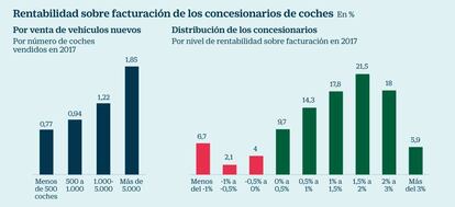 Según alertan los datos de la consultora MSI para Faconauto a los que ha tenido acceso Cinco Días, el 50% de los concesionarios de España venden menos de 500 coches al año. Esto supone que registran una rentabilidad sobre facturación del 0,7%. Es un dato en positivo pero muy lejos del 2,5% que la federación de asociaciones de concesionarios Faconauto considera adecuado para hacer frente a las inversiones necesarias para llevar adelante el negocio y para adecuarse a la venta por internet o a las nuevas experiencias de compra.