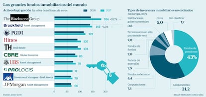 La lista de los 10 grandes propietarios la completan CBRE Global Investors, UBS Asset Management, Prologis, AXA Investment Managers y J.P. Morgan Asset Management. De los 2,7 billones de propiedades, el 83,3% está en manos de gestoras no cotizadas, según este informe llamado Fund Manager Survey. Este tipo de sociedades invierten con sus propios vehículos (alrededor del 45,5%), pero también pueden invertir para otros o a través de joint ventures o club deals. Respecto a la ubicación, el 36,9% de los activos se encuentran en Europa, el 33,8% en Norteamérica y el 16,9% en Asia-Pacífico.