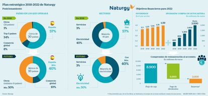 Naturgy pretende reducir el peso del gas en su mix energético y equilibrarlo con el de la electricidad y los negocios regulados (redes). Frente a un 52% que ahora representan estos negocios, se alcanzará el 70% en 2022. En cuanto al gas, que hoy supone un 57%, frente al 40% de la electricidad, en cinco años, el reparto se invertirá: un 40% el gas y un 50% la electricidad (los servicios pasarán del 3% al 10%).