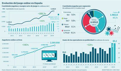 El juego online gana adeptos en España. En el último lustro, los españoles han triplicado el dinero que destinan a las distintas modalidades de azar en formato digital, que incluyen las operaciones en casinos virtuales, los concursos por internet, el bingo, el póquer o las apuestas, según los datos recopilados por la Secretaría de Estado de Hacienda. Un auge que se explica en buena medida por la decisión de las casas de juego de doblar la inversión que destinan a publicidad, así como por la vinculación de buena parte del negocio a grandes eventos de masas. Así, solo el arranque de la Copa Mundial de Fútbol de Rusia, en la segunda quincena de junio, incrementó un 47% el margen neto de juego de las apuestas deportivas del segundo trimestre de este año frente al mismo periodo del ejercicio anterior.