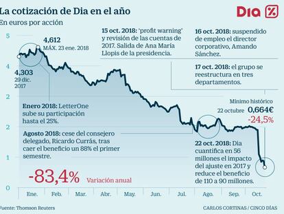 Este precio es sensiblemente inferior a de la cotización de la acción el pasado 19 de enero, cuando Letterone elevó su participación en Dia del 10% al 15% y notificó su compromiso de hacerse con un 10% adicional a plazo. Este compromiso de compra se elevó a un 14% en septiembre. Aquel 19 de enero enero, el precio de los títulos era de 4,41 euros, 77 céntimos menos que ese precio unitario de 3,64, lo que le ha generado un ahorro de 67,1 millones de euros gracias a la utilización de ese instrumento financiero. A todos los efectos, LetterOne ya es dueño del 29% de Dia.