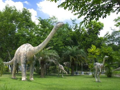 Una vez allí, los visitantes atraviesan las icónicas puertas del Mundo Jurásico para acercarse lo más cerca posible a las colosales criaturas, algunas de más de siete metros de altura.