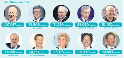 Este 2018, que está a punto de acabar, ha sido un mal año para la Bolsa y, por lo tanto, también para la mayoría de los multimillonarios, que tienen gran parte de sus fortunas en acciones de empresas. De los diez hombres más adinerados del Planeta (no hay mujeres en la lista), solo dos han aumentado su patrimonio este año: el fundador de Amazon y líder de la lista por segundo año consecutivo, Jeff Bezos, y Bernard Arnault, dueño de las marcas de lujo Louis Vuitton y Christian Dior. Los ocho restantes han reducido sus números, siendo Mark Zuckerberg, creador de Facebook, y Amancio Ortega, único español en la lista y dueño de Inditex, los que más han perdido en 2018. En el caso de Zuckerberg, un 27% (17.100 millones de euros); y Ortega, un 23% (15.000 millones).
