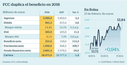 El resultado antes de impuestos cosechado por FCC casi duplica al de 2017, con 358 millones (un 96% más) ante la reducción del 19% en el resultado financiero neto (-209 millones). La empresa que preside Esther Alcocer carga, tras la refinanciación del pasado verano, con una deuda de menor volumen y más barata. También ha duplicado la contribución de sus participadas hasta los 67 millones.