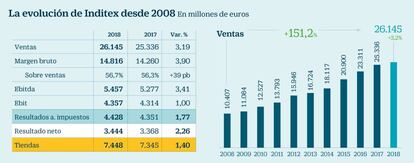 Inditex, el grupo textil fundado por Amancio Ortega, cerró el ejercicio fiscal 2018 con un un nuevo récord de ventas y de beneficios. La compañía radicada en Arteixo (La Coruña, Galicia) registró unos ingresos de 26.145 millones de euros, un 3% más que un año antes, y unas ganancias de 3.444 euros, un 2% por encima de la cantidad registrada en el ejercicio 2017. Estas cifras están por debajo de las previsiones trazadas por las analistas (en torno a 3.480 millones), y la acción ha cedido un 4,45% en Bolsa, quedando en 25,10 euros. Lejos, aun así, de los mínimos del año.