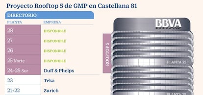 El propietario del edificio Castellana 81, la socimi GMP, ha lanzando un proyecto llamado Rooftop 5, para encontrar inquilino en los últimos cinco niveles de la torre, la que hasta diciembre de 2017 fueran las plantas nobles de la sede de BBVA. Del proyecto de comercialización se encarga la consultora inmobiliaria Savills Aguirre Newman.