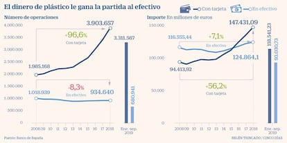El dinero electrónico sigue ganándole la batalla al efectivo. El año 2016 marcó el punto de inflexión en el cual el importe de las operaciones realizadas con tarjetas, ya fueran de débito o de crédito, superó por primera vez en la historia a la retirada de dinero en efectivo en los cajeros. Una tendencia que se ha ido acelerando desde esa fecha y que ha marcado un nuevo máximo histórico al cierre del tercer trimestre, según los últimos datos del Banco de España. Entre julio y septiembre de 2019, las operaciones con efectivo bajaron un 4,13% hasta las 230.444, acumulando dos trimestres en caída, mientras que el importe retirado también retrocedió un 1,1% hasta los 32.304 millones de euros. En paralelo, las operaciones con tarjetas subieron un 16,8% hasta las 1,18 millones y el importe retirado también avanzó un 9,65% hasta los 42.528 millones de euros.