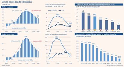 Los particulares adeudan el 59% del PIB, en la media europea; y las sociedades, un 75%, ya inferior a la Unión Económica y Monetaria
