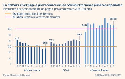 En España, la regulación de morosidad de la Ley Orgánica de Estabilidad Presupuestaria y Sostenibilidad Financiera fija también un periodo máximo de pago de 30 días. Los últimos datos recopilados por Hacienda, de noviembre de 2019, indican, sin embargo, que solo la administración central cumple, con un periodo medio de pago de 26,5 días, mientras que las comunidades autónomas pagan a sus proveedores, de media, a 39,75 días y las locales superan incluso el límite excesivo de 60 días, pagando a los 66. Es cierto, no obstante, que los datos de estas dos últimas administraciones se vieron empeorados el año pasado por el retraso en la actualización de las entregas a cuenta que les inyecta el Estado.
