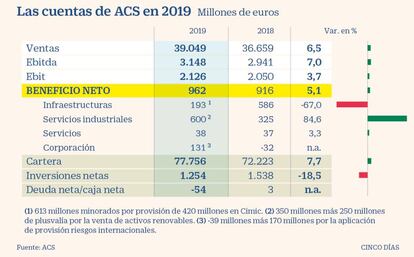 El grupo ACS se ha acercado en 2019 a su objetivo de 1.000 millones de euros de beneficio neto. La compañía ha obtenido un resultado atribuible de 962 millones, lo que representa un alza del 5,1%, tras descontarse 420 millones por el anunciado resultado negativo de la venta de BICC, la división de Cimic en Oriente Medio. Ese impacto ha sido compensado con los 250 millones de resultado extraordinario obtenido con la venta de las plantas fotovoltaicas en España y la suma de otros 170 millones por la aplicación de una provisión por riesgos internacionales.