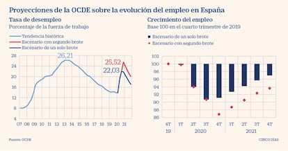 “De hecho, las recientes proyecciones de la OCDE sugieren que la tasa de desempleo podría incluso alcanzar un máximo a finales de 2020, aunque no se produzca un nuevo brote de la pandemia a finales del año”, advierte. En concreto, según la base de datos del organismo internacional, la previsión de la OCDE es que la cota de paro pueda llegar a alcanzar el 25,5% de la población activa en el cuarto trimestre del año. Se trataría del umbral más alto desde 2013, cuando se llegó a superar el 26% de tasa de desempleo como consecuencia de la anterior crisis.