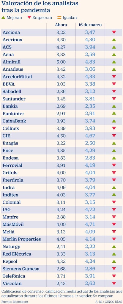 Otro de los sectores fuertemente golpeados desde el estallido de la crisis ha sido el bancario. A su condición de cotizadas cíclicas se unen las dificultades previas para obtener rentabilidad. Aunque el BCE ha desplegado una artillería de medidas para aliviar las tensiones (ha rebajado las exigencias regulatorias y regado de liquidez al sector) son muchos los inversores que cuestionan la viabilidad del negocio en un entorno de tipos cero. A diferencia de la crisis anterior, ahora no se cuestiona la solvencia sino su rentabilidad. Estas dudas se trasladan a las recomendaciones. Desde los mínimos de marzo solo dos entidades del Ibex 35 experimentan mejoras en sus recomendaciones. Se trata de Bankia y CaixaBank. La entidad que preside José Ignacio Gorigolzarri eleva de tres a cinco los consejos de compra a la vez que reduce a seis frente a las 11 anteriores las firmas que aconsejan vender acciones de la compañía. CaixaBank incrementa en dos (16) las recomendaciones de compras y rebaja de cuatro a dos los consejos de venta.