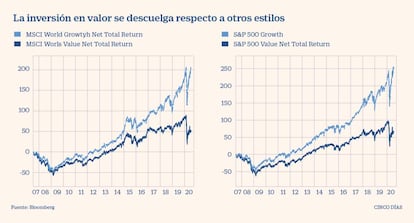 Entre 1920 y 2007 la inversión en valor partió la pana. Esta estrategia, basada en identificar compañías infravaloradas por el mercado para comprarlas cuando están baratas y lograr así un amplio margen de seguridad para que se revaloricen, ha convertido en millonarios y célebres a inversores como Warren Buffett (uno de los hombres más ricos del mundo), Peter Lynch o Francisco García Paramés. Sin embargo, desde la gran crisis de 2008 le está costando levantar cabeza.