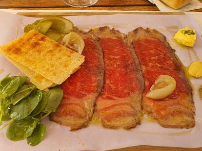 Entre las platos sublimes, convertidos en clásicos, se encuentra la falsa lasaña de txangurro (21,50 euros), un bocado que se convierte en puro disfrute, o la tortilla vaga (hecha solo por un lado y que cada vez replican en más restaurantes) de morcilla, puerro, patata y piparra (19,50 euros).Es tiempo de sardinas, y la ofrece ahumada y acompañada de un ajoblanco (7 euros la unidad), y de brevas con jamón (20,60 euros), como obligados son los delicados bocados de merluza a la romana acompañada de una mayonesa elaborada con la esencia del mismo pescado (27,30 euros), el tuétano asado (26,05 euros), el Villagodio al tuétano (58,10 euros para dos personas), o la ventresca de atún a lo ibérico, con un velo de panceta por encima (28 euros). De postre, frambuesas al gusto, que puede ser con un buen chorro de Oporto (7,25 euros) o tarta de queso dispersa (10 euros). Interesante carta de vinos.