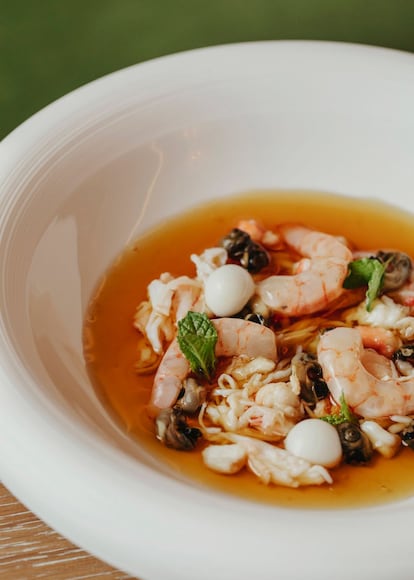 Para empezar ofrece unas vistosas crudités de verduras frescas de temporada, que se sirven acompañadas de una salsa muhammara (22 euros), o unas láminas de remolacha (18 euros). Como en todo restaurante de hotel que se precie no falta la ensalada César, a la que añade su toque particular con sardinas ahumadas, pollo, parmesano y almendras (22 euros).