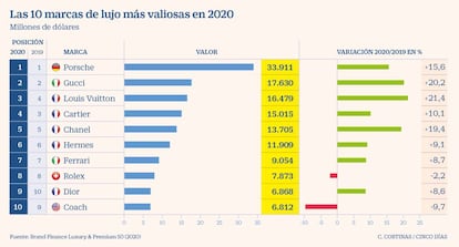 Sigue siendo la marca de lujo más valiosa del mundo. Porsche mantiene, por tercer año consecutivo, el título de la firma dentro de la industria de alta gama, con más reconocimiento del planeta, con un aumento del valor del 15,6% hasta los 28.700 millones de euros (33.911 millones de dólares). La firma mantiene además un margen considerable respecto de su rival más cercana, la italiana Gucci en segunda posición a la que prácticamente duplica en valor de marca 14.630 millones de euros (17.630 millones de dólares).