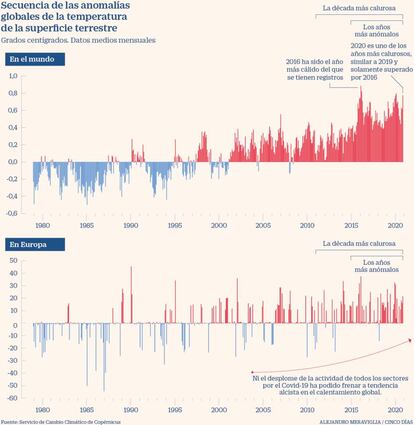 “Sabemos que las temperaturas han aumentado en más de un grado centígrado desde la era preindustrial y que la tendencia al alza continuará a medida que aumenten las concentraciones de gases de efecto invernadero en la atmósfera, es decir, si los países no reducen las emisiones según sus compromisos asumidos en virtud del Acuerdo de París”, agrega Carlo Buontempo, director del servicio de cambio climático de Copernicus.