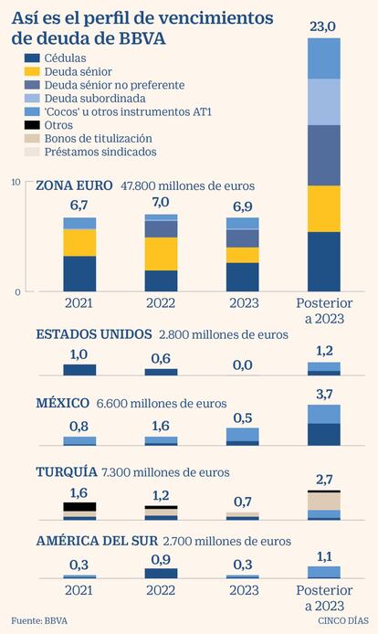 Los vencimientos de deuda en la zona euro en 2021 de BBVA suman 6.700 millones. La mayor parte no necesitará refinanciación. Pero en la entidad señalan que “es una situación transitoria”, en función del uso de esos recursos".