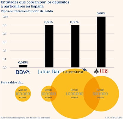 Por el momento, además de BBVA, algunas firmas extranjeras suizas que operan en España han gravado los depósitos de los grandes clientes. En concreto, Julius Baer y Credit Suisse cobran una tasa del 0,50% a partir de 100.000 euros y de un millón de euros, respectivamente. UBS aplica un interés del 0,6% desde 500.000 euros. Por su parte, a partir de abril, ING cobrará 10 euros a los clientes sin la nómina domiciliada que tengan en su cuenta más de 30.000 euros.