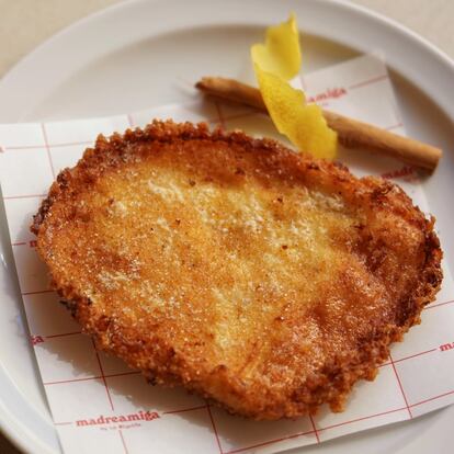 El pastelero Ricardo Vélez, alma mater de la pastelería Moulin Chocolat (Alcalá, 77) elabora una torrija (2,80 euros) a partir de una masa de brioche horneada en molde cilíndrico, que se corta en diagonal para extraer exactamente tres rebanadas del bollo. Durante una noche, el brioche se cala con nata, leche ecológica, azúcar Circa, canela, limón, vainilla y yema de huevo, una mezcla que da como resultado una especie de crema inglesa en la que se infusionan las rebanadas sin hervir. Al día siguiente se hornean a fuego vivo a 220 grados, durante pocos minutos, para que la crema líquida se quede como una seminatilla dentro del propio pan de brioche. Una vez salen del horno y pierden un poco de calor, se rebozan en azúcar con canela Ceilán en polvo. www.moulinchocolat.comEcharle imaginación a la torrija. Desde hace años, uno de los pioneros es José Fernández-Ramos, de la pastelería Nunos (Narváez, 63), que cada año presenta una colección. Para 2021 ha lanzado las torrijas de distintas leches (52 euros el kilo): de soja, de avena, de chufa, de coco, de arroz, de cabra... www.pasteleria-nunos.esEl jefe del obrador de Juliettas (www.juliettas.es), Daniel González, ha creado dos vistosas torrijas, de espirulina azul (5,70 euros) y de té matcha (4,50).De masa de roscón y horneadas, en vez de fritas, son las torrijas de Pan.Delirio (24 euros el kilo, en el obrador de Juan Bravo, 21)En Madreamiga (Teruel, 26) apuestan por la clásica, elaborada con pan de torrija de masa madre, mantequilla francesa, leche, azúcar, canela, aceite de girasol, naranja y limón. www.madreamiga.comPastelería Mallorca se ha atrevido este año a crear una torrija de trufa negra en colaboración con el cocinero Nino Redruello, además de la tradicional, para la que crea un pan especial que baña en leche aromatizada. www.pasteleria-mallorca.comEn La Mallorquina siguen la receta original (2,80 euros): pan bañado en leche aromatizada con canela y limón, pasadas por huevo, fritas en aceite y cubiertas con azúcar y canela. www.pastelerialamallorquina.es