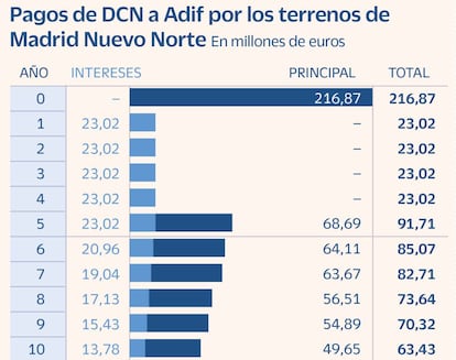 En el momento en que esté firmado el documento, DCN ejercerá su histórico derecho de compra sobre los terrenos de Adif, un acuerdo que se remonta a los años noventa aunque posteriormente fue renegociado. El administrador ferroviario, presidido por Isabel Pardo de Vera, es el principal propietario de los terrenos de ese ámbito al norte de la capital, un macrodesarrollo conocido anteriormente como la Operación Chamartín. El promotor pagará a Adif 984 millones más 261 millones de intereses en 20 años, según el pacto alcanzado por las dos partes.