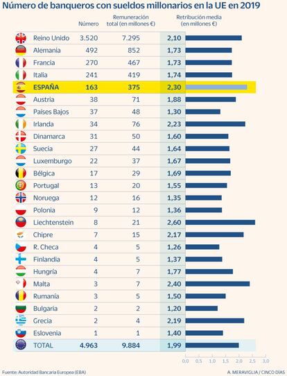 España es el quinto país de la Unión Europea (UE) en el que más banqueros tienen un sueldo millonario. Según un informe publicado por la Autoridad Bancaria Europea (EBA, por sus siglas en inglés), un total de 163 banqueros españoles percibió más de un millón de euros en 2019, con una remuneración conjunta de 375 millones, lo que supone una media superior a 2,3 millones, la tercera más alta de la UE.