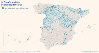 Más de la mitad de los municipios españoles no tienen una sola oficina bancaria. El progresivo recorte de la red unido a la apuesta por la banca online han dejado a buena parte de la denominada España vaciada sin una sucursal a la que acudir para gestionar de forma presencial sus finanzas. Según los datos del Banco de España actualizados a cierre de junio, de los 8.131 municipios que hay en España, 4.443 no tenían oficina, el 54%. En total más de 1,6 millones de personas están sin acceso a una oficina en su municipio.