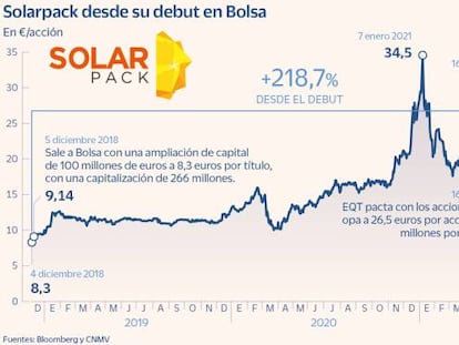 La Comisión Nacional de los Mercados y la Competencia (CNMC) ya dio también su visto bueno a la opa el pasado 7 de julio. Los 26,5 euros por acción ofrecidos por EQT suponen una contraprestación de 881,2 millones de euros por la totalidad de las acciones de la compañía española e implica una prima del 43% respecto a la cotización de las acciones de Solarpack a cierre del día que se anunció la oferta. Hoy se negocia a 26,45 euros.