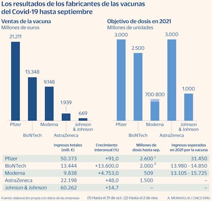 Hasta septiembre, esta firma de Cambridge (EE UU) ha comercializado más de 500 millones de dosis y tiene el objetivo de producir hasta 800 millones a final de año. Eso supondrá entre 13.000 y 15.725 millones en facturación, según sus previsiones anunciadas recientemente.