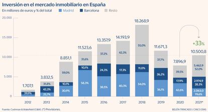 Esa cifra vuelve a la senda previa a la aparición de la pandemia, ya que en 2019 se cerraron operaciones por valor de 11.670 millones. La cifra de inversión se mantiene en la tendencia elevada surgida a partir de 2015, cuando entró con fuerza el capital internacional y de las socimis en un sector en recuperación.