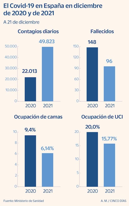 La aparición de la variante ómicron hace menos de un mes ha llevado a España a su peor momento de la pandemia. Este miércoles, se ha registrado el segundo récord consecutivo de contagios por covid notificados en un día, 60.014. Pero con casi el 90% de la población diana con la pauta completa de vacunación, las hospitalizaciones por Covid son un 57% menores a las notificadas hace un año, a pesar del incremento desbocado de los contagios.