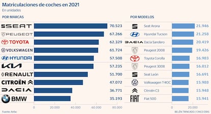 Seat se ha marcado un doblete en 2021 al liderar las ventas en España tanto en el rubro de modelos como en el de marcas. Su Arona (un SUV) ha sido el vehículo más comercializado del año con un total de 21.946 unidades matriculadas, consiguiendo así recuperar el trono de los vehículos más vendidos después de que en 2020 ese honor fuese para el Dacia Sandero. En cuanto a la tabla de posiciones por fabricantes, Seat se ha colocado como la única firma en superar las 70.000 unidades en un año marcado por la escasez de microchips en todo el mundo, factor que ha impedido que las ventas se recuperasen y siguieran en números similares a los de 2020 (apenas se incrementaron un 1%).
