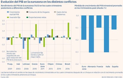 Si se analiza por países, se observa que Alemania e Italia históricamente han mostrado una sensibilidad por encima del promedio a los shocks negativos, mientras que Francia y España suelen ser más resilientes. Es revelador que mientras la Eurozona registró un frenazo en su crecimiento del -0,2% en el año posterior a cada conflicto, en el caso español solo fue del -0,1%, según UBS.