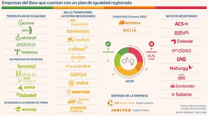 Esta nueva norma también incluye por primera vez la obligatoriedad de registrar estos planes en el Regcon. “Hasta entonces solo hacía falta cuando la obligación estaba en el convenio colectivo sectorial”, aclara Beatriz Ardid, directora y responsable de la línea de negocio de igualdad, diversidad e inclusión en Peoplematters. Pero, por el momento, solo cinco empresas del Ibex (Acciona, Acerinox, Almirall, Amadeus y Telefónica) cuentan con planes completamente registrados y en vigor. Si bien hay cinco más en proceso de registro o acordados a la espera de firmarse. Los planes deben ser revisados previamente por parte de las autoridades laborales y, debido al incremento de solicitudes en el último año, la oficina está saturada y este proceso puede llegar a tardar meses. “Solo en 2021 se registraron más que en los últimos 14 años”, expone Begoña Marugán, adjunta a la secretaría confederal de mujeres, igualdad y condiciones de trabajo de CC OO. Así ha sucedido con Ferrovial, Merlin Properties y Red Eléctrica.