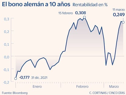 Aun así, la inmediata reducción de las compras de activos fue argumento suficiente para amparar el alza de las rentabilidades. La deuda soberana, que con el estallido del conflicto había hecho valor su papel de activo seguro, aceleró las pérdidas. Una tendencia que fue generalizada. El rendimiento del bono español a 10 años sumó 27 puntos básicos y roza el 1,24%, niveles previos al inicio de la contienda. La deuda italiana al mismo plazo avanzó 31 puntos básicos, hasta el 1,85% y la alemana, 32. En cuestión de días, el bund ha pasado de registrar rendimientos negativos a situarse en 0,25%.
