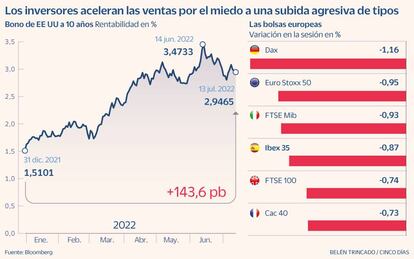 Con el temor de recesión como telón de fondo los inversores aprovechan la mínima para reducir su exposición al riesgo, un movimiento que se traduce en nuevas caídas para las Bolsas. El Dax alemán, que en las últimas jornadas ha padecido las interrupciones del suministro de gas a través de Nord Stream 1, cedió ayer 1,16%. El Cac francés cayó un 0,73%; el Mib italiano, 0,93% y el FTSE británico. Al cierre de los mercados europeos el Dow Jones caída un 0,4% mientras el Nasdaq cotizaba en tablas.