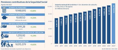 La Seguridad Social publicó este viernes una nueva radiografía detallada de la nómina mensual de las pensiones: cuántas hay, de qué tipo, cuánto se paga y cómo evoluciona este gasto público, que es el más elevado del presupuesto (más de 140.000 millones de euros anuales). Como es habitual mes a mes desde hace años, el dinero desembolsado por la Seguridad Social a principios de agosto para pagar 9,9 millones de pensiones a nueve millones de pensionistas –un millón de estas personas compatibiliza dos prestaciones– volvió a batir un récord.