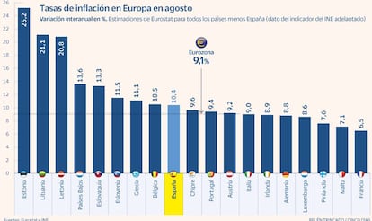 Esto contrasta con el dato de España, conocido ayer. Los precios en España se incrementaron un 10,4%, frente al 10,8% interanual registrado en julio, con la subyacente en ascenso hasta el 6,4%. En la comparación entre los dos meses la inflación se incrementó una décima.