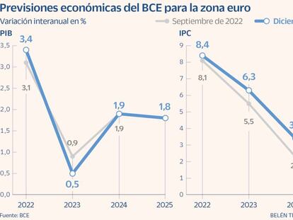 El BCE prevé ahora que la inflación de 2022 será del 8,4% y disminuirá al 6,3% en 2023, frente al 8,1% y el 5,5% que esperaba en septiembre. En 2024, los precios aún seguirán subiendo el 3,4% y en 2025, el 2,3%, todavía por encima del 2% del objetivo del banco central. La inflación subyacente quedará este año en el 3,9% pero subirá al 4,2% en 2024. Descendería al 2,8% en 2024 y al 2,4% en 2025, una décima por encima de la tasa general que prevé el BCE. “La inflación de los precios de los alimentos y las presiones inflacionistas subyacentes en el conjunto de la economía han aumentado y persistirán durante algún tiempo”, reconoce el comunicado de la institución.