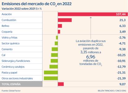 A pesar de la visibilidad de los fenómenos climáticos extremos que azotan a España, desde la sequía histórica hasta las temperaturas inusualmente cálidas de este invierno, los responsables son mucho menos evidentes. Las emisiones del mercado verificado (medido) de CO2 en España aumentaron un 9,07% en 2022, según la consultora medioambiental Global Factor, basadas en el fin de la crisis sanitaria y el regreso a la normalidad. Tres grandes sectores fueron los responsables de este incremento: las instalaciones de combustión aumentaron sus emisiones un 21,3% en comparación a 2021, un poco por encima de la refinería, con un crecimiento del 6,3%. Pero la corona se la lleva la aviación, que duplica el total de emisiones contaminantes frente al año anterior hasta llegar a los 6,96 millones de CO2 el último año.