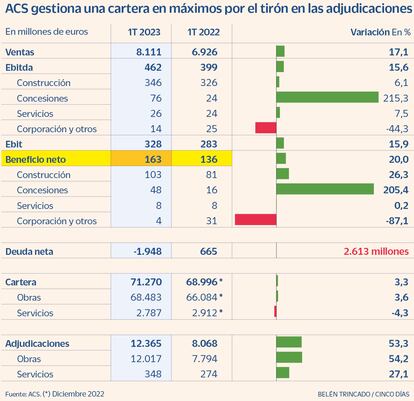 El conglomerado que preside Florentino Pérez alcanza los 8.111 millones en ingresos, con una mejora del 17%, mientras que el ebitda, de 462 millones, aumenta un 15,6%. La mínima rebaja en el margen (del 5,76% de marzo de 2022 al actual 5,69%) se debe a una menor contribución de los negocios de energía tras las desinversiones de 2022 y a lo que ACS denomina resultados de Corporación. El ebit se ha situado en este inicio del año en 328 millones (un 15,9% más).