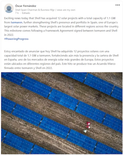 El grupo Shell ha adquirido una cartera de 12 proyectos solares con una capacidad total de 1,1 gigavatios (GW) a la consultora focalizada en inversión verde y transición ecológica Isemaren a un precio no desvelado. La operación ha sido comunicada por Óscar Fernánez, presidente de Shell España, a través de una entrada en su cuenta de la red social Linkedin, y confirmada a CincoDías por la filial española de la energética.