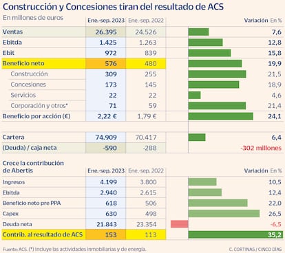 Los negocios de construcción y operación de infraestructuras tiran con fuerza similar del resultado de ACS al cierre del tercer trimestre. El grupo ha declarado un beneficio neto de 576 millones a 30 de septiembre, lo que supone una mejora del 19,9% respecto a los tres primeros trimestres de 2022. El área de Construcción aporta 309 millones, con un ascenso del 21,5%, mientras que el beneficio de Concesiones crece un 18,9% y se sitúa en 173 millones. El negocio de Servicios entrega 22 millones, superando en un 4,6% el resultado declarado en septiembre del año pasado. En este último caso la compañía da los primeros pasos para la venta de la filial Clece.