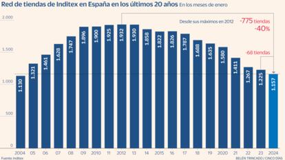La cifra resultante supone dejar la red de tiendas físicas casi al mismo nivel con el que contaba a 31 de enero de 2004, fecha de cierre del año fiscal 2003. Entonces Inditex contaba con 1.130 establecimientos, aunque el contexto ha cambiado en los últimos dos decenios. En aquella época, Inditex estaba en plena expansión de sus puntos de venta, con una escalada progresiva que le llevó a tener 1.932 establecimientos en España en 2013, el máximo histórico. Desde entonces, la red se ha reducido en un 60%, o lo que es lo mismo, ha menguado en 775 establecimientos en los últimos 11 años.