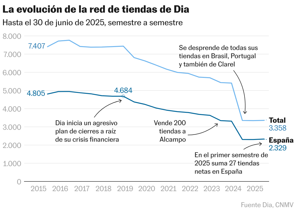 A ello se ha sumado, más recientemente, varias operaciones de venta. Por una parte, las más de 200 tiendas que Dia traspasó a Alcampo durante el año 2023; y por otra, el millar de establecimientos que formaban parte de Clarel, la cadena de droguerías que traspasó al grupo colombiano Trinity en la primera mitad de 2024.